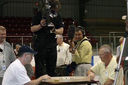 TVOntario Producer/Director Robert Prowse (left) had a film crew at the 2004 tournament. Above, cameraman Kevin Glecoff and soundman Maurice Palzot get above the board with opponents Brian Cook (seated left) and champion Joe Fulop. The 7-minute documentary aired in June on Studio 2.