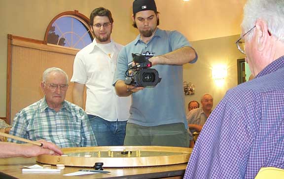 Documentary film team, cousins Jonathan Steckley (with camera) and Joshua Steckley film players at the Tavistock Missionary Church's bi-weekly crokinole night in Tavistock. They will be putting together a documentary film of the annual tournament.